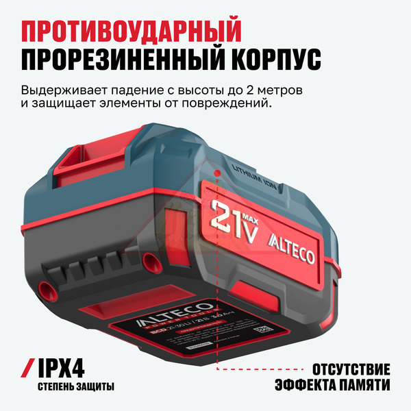Аккумуляторная батарея для линейки инструментов ALTECO с напряжением 21Vmax разработана с использованием высокотоковых элементов, которые устойчивы к перегрузкам и обеспечивают длительный срок службы даже при экстремальных условиях эксплуатации.