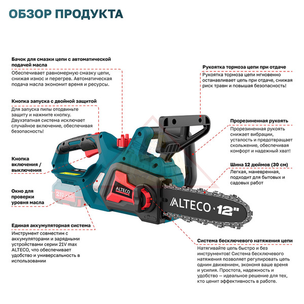- Система автоматической подачи масла эффективно смазывает цепь во время работы, обеспечивая ее долговечность и улучшенную производительность. Это снижает трение и износ, а также исключает необходимость в ручном вмешательстве.