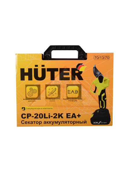 Модель СР-20Li-2K EA+ Huter оснащена бесщёточным электродвигателем и работает от литий-ионной аккумуляторной батареи ёмкостью 2 А*ч. Напряжение – 20 В. Рабочим инструментом секатора является односторонний нож, способный обеспечивать надёжный срез веток и сучьев диаметром до 30 мм. Корпус аккумуляторного секатора выполнен из противоударного пластика и хорошо защищён от попадания внутрь опилок и других отходов при выполнении обрезки. Есть защита от несанкционированного запуска. Вес – 2.625 кг.