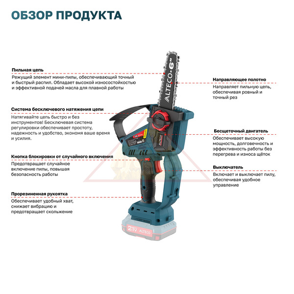 Бесщеточная аккумуляторная мини пила ALTECO CMC 21-15 BL Solo (без АКБ и ЗУ) компактный, мощный и удобный инструмент, который идеально подходит для выполнения различных бытовых и садовых задач. Пила оснащена бесщеточным двигателем, обеспечивающим высокую производительность, долговечность и экономичное потребление заряда аккумулятора.
