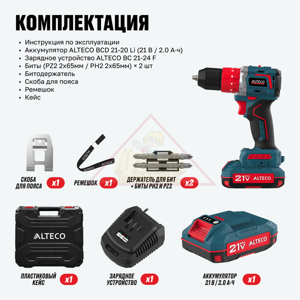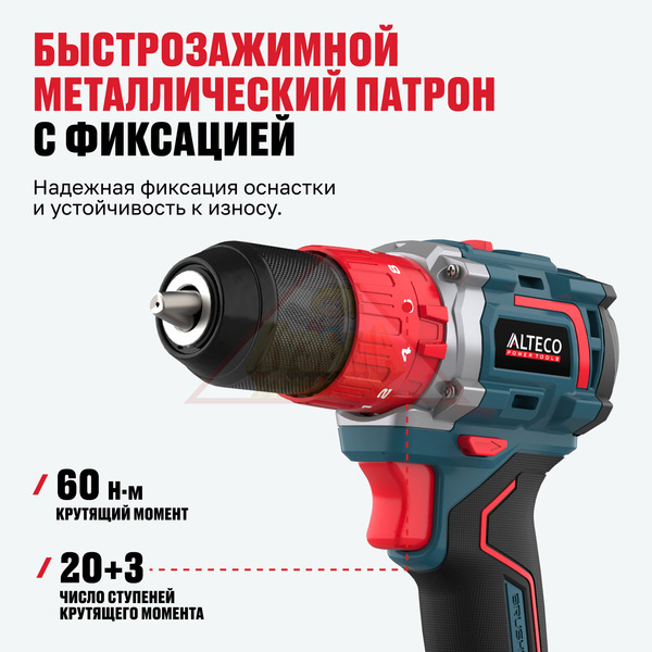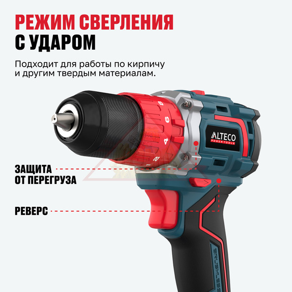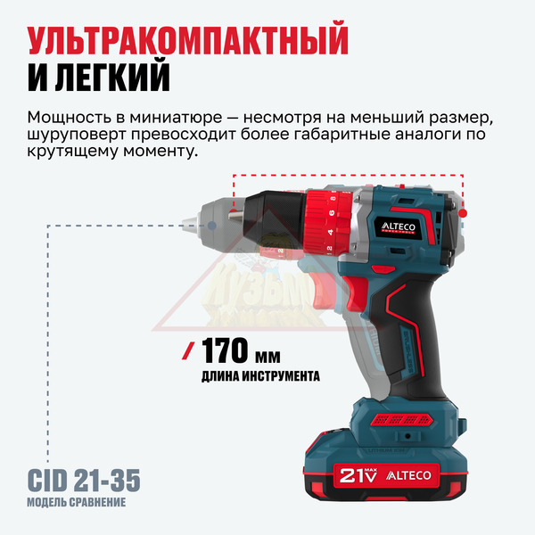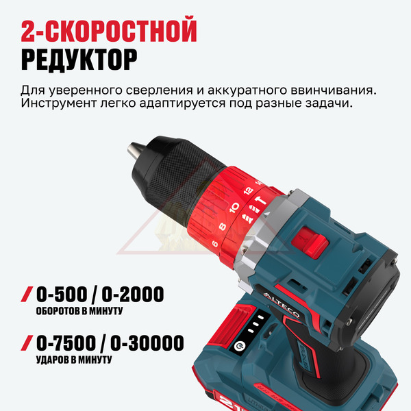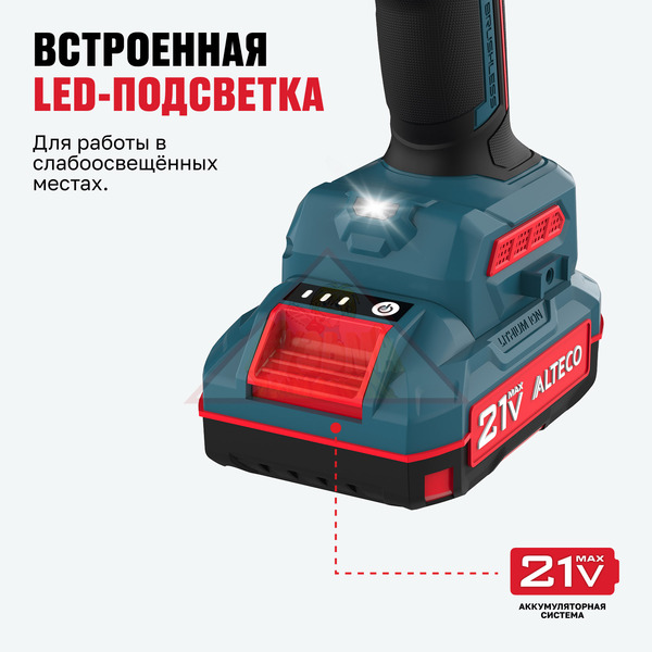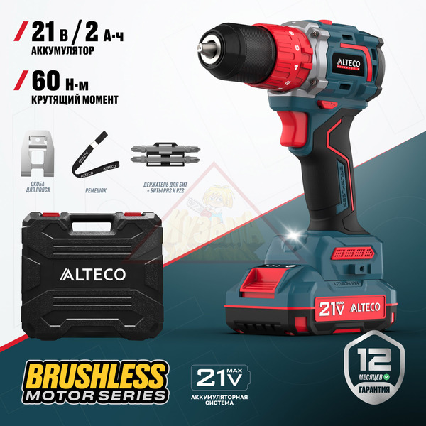 Бесщеточная аккумуляторная ударная дрель-шуруповерт ALTECO CID 21-60 BL – ультракомпактный и легкий с мощным бесщеточным двигателем для профессионалов. Благодаря бесщеточному двигателю и крутящему моменту до 60 Нм он легко справляется с крепежом в твердых материалах, а эргономичный дизайн и легкий корпус обеспечивают комфорт даже при длительной работе. Инструмент оснащен LED-подсветкой, двумя скоростями и ударным режимом, а совместимость с аккумуляторной системой ALTECO 21Vmax делает его универсальным решением для любых задач. В комплекте – все необходимое для старта, включая биты и удобный кейс.