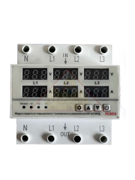 Автоматический защитный модуль АЗМ-63/3АРД регулируемый (с дисплеем) Ресанта - автоматическое устройство защиты от повышенного/пониженного напряжения, в основном используемое для низковольтных распределительных линий для бытовых и аналогичных целей, автоматически обнаруживает сбой, связанный с повышением или понижением напряжения, и отключает нагрузку. При восстановлении нормальных условий на линии, автоматически включает нагрузку. Включение и выключение происходит за счет трех электромагнитных реле.