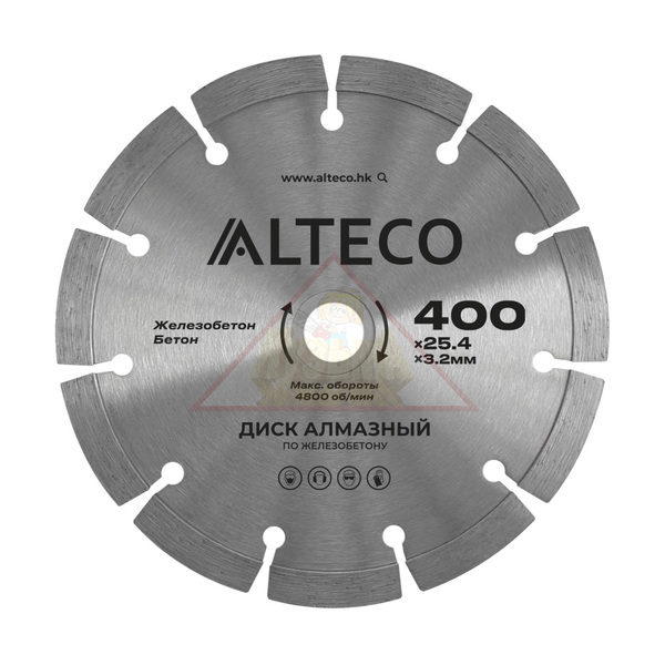 Диск алмазный ALTECO 400x25.4x3.2 мм применяется для сухого реза по железобетону. Толщина алмазного сегмента - 3.2 мм.