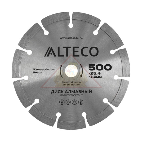 Диск алмазный ALTECO 500x25.4x3.6 мм применяется для сухого реза по железобетону. Толщина алмазного сегмента - 3.6 мм.