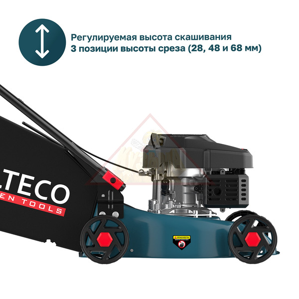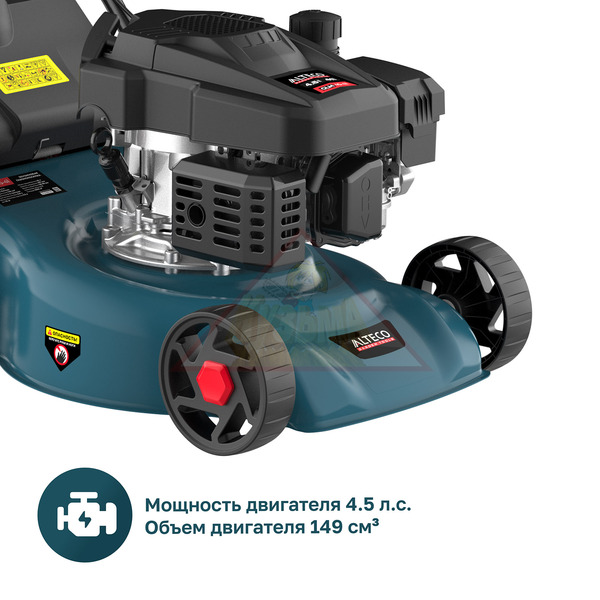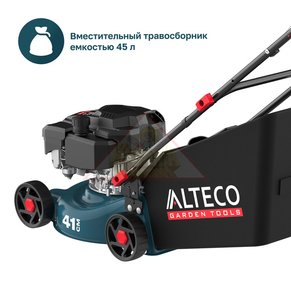 Газонокосилка бензиновая ALTECO GLM 45-41 идеально подходит для небольших участков до 1000 м², Ширина скоса 41 см и прочный нож обеспечивают ровное и аккуратное кошение, Три уровня высоты среза, настраиваемые для каждого колеса, дают гибкость в уходе за газоном и позволяют легко подстроиться под нужный уровень травы.