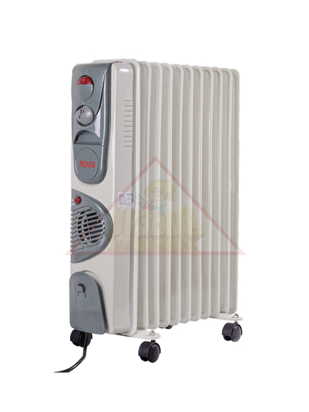 Металлический корпус масляного радиатора состоит из 11 секций, заполненных минеральным маслом. ТЭН суммарной мощностью 2500 Вт греет масло, которое свободно циркулирует в герметичном корпусе и отдает тепло за счет конвекции. Также радиатор оснащен вентилятором, который повышает теплоотдачу с поверхности секций, разгоняя нагретый воздух по помещению.