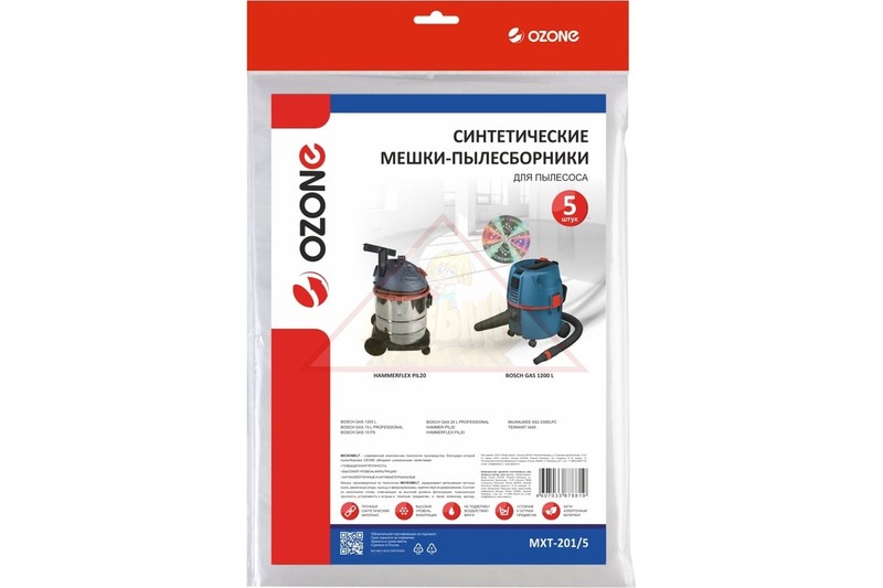 Комплект мешков OZONE MXT-201/5 создан для удобной и эффективной уборки. Они подходят для пылесосов BOSCH GAS 15, BOSCH GAS 20, FLEX и HAMMER и идеально справляются как с сухой, так и с влажной пылью. Прочные синтетические мешки не рвутся, сохраняют форму и обеспечивают стабильную мощность всасывания, благодаря чему пылесос работает на полную мощность долгое время. В упаковке пять мешков — этого хватает на продолжительный срок без частой замены. Надёжность и долговечность делают их отличным выбором для дома, мастерской или ремонта. С OZONE MXT-201/5 вы можете быть уверены: уборка пройдёт быстро, удобно и без лишних забот, а ваш пылесос будет работать как новый.