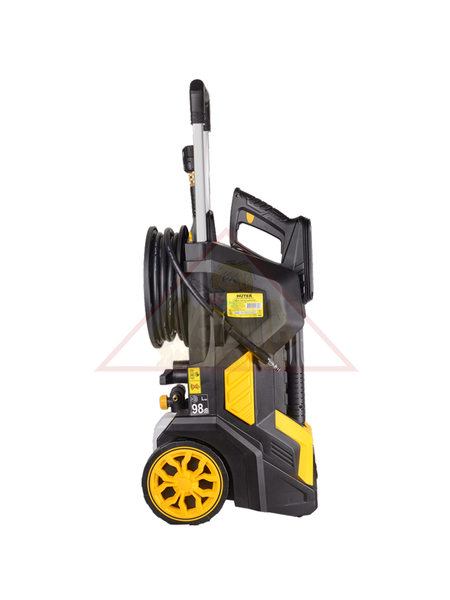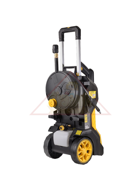 Профессиональный пеногенератор позволяет наносить моющие средства прямо на поверхность, улучшая качество очистки. Шланг длиной 10 метров обеспечивает свободу перемещения и доступ к удалённым объектам. Удобный механизм для намотки длинного шланга на барабан облегчает хранение и транспортировку оборудования. Колёса и удобная ручка делают перемещение мойки лёгким и безопасным.
