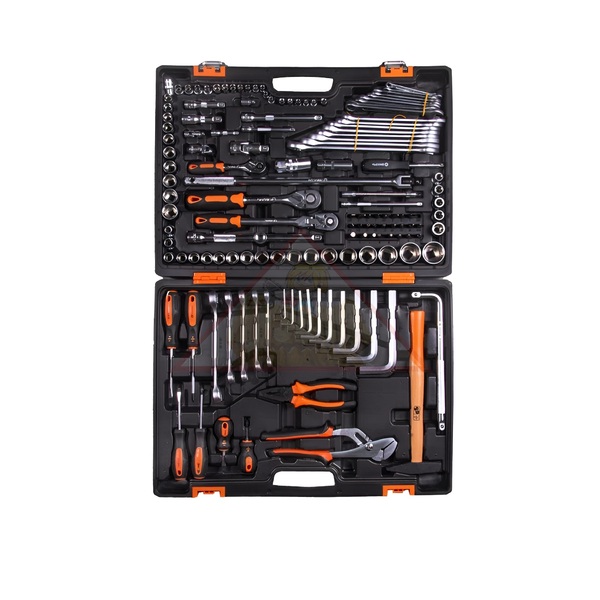 Комплект включает в себя предметы с различными присоединительными размерами: 3/8", 1/2" и 1/4", что позволяет работать с широким спектром крепежных элементов. Инструменты предназначены для эффективного монтажа и демонтажа резьбовых соединений, обеспечивая надежность и точность выполняемых операций. В набор входят разнообразные головки, биты, ключи, удлинители и другие аксессуары, необходимые для работы с крепежом разных типов и размеров.
