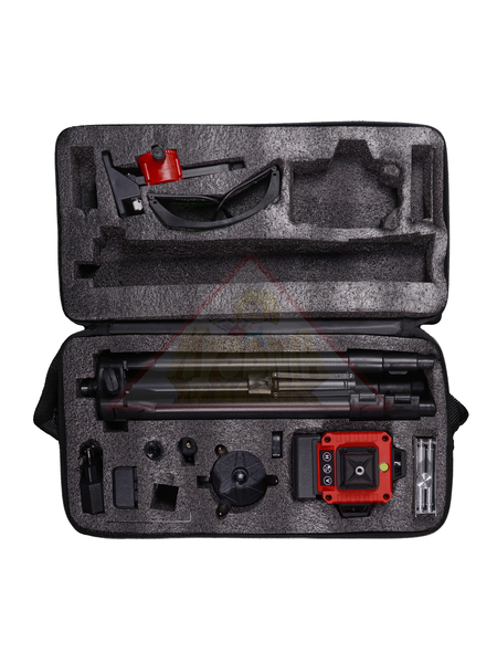 Устройство работает от аккумулятора, что обеспечивает мобильность и удобство использования без привязки к электросети. В комплект входит штатив, который обеспечивает устойчивое положение построителя и позволяет регулировать высоту. Устройство поставляется в удобном кейсе, что облегчает его хранение и транспортировку.