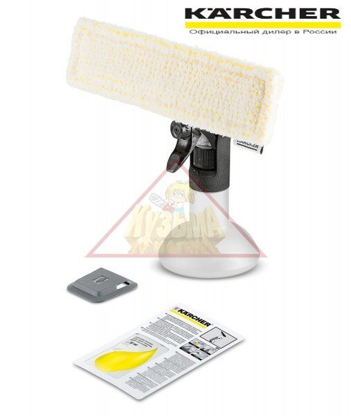 Комплект для мойки гладких поверхностей с использованием аккумуляторного стеклоочистителя Karcher WV включает пульверизатор с насадкой регулируемой рабочей ширины для протирания, обтяжку из микроволокна с застежкой-липучкой, скребок для удаления стойких загрязнений и концентрат средства для мойки окон (20 мл).