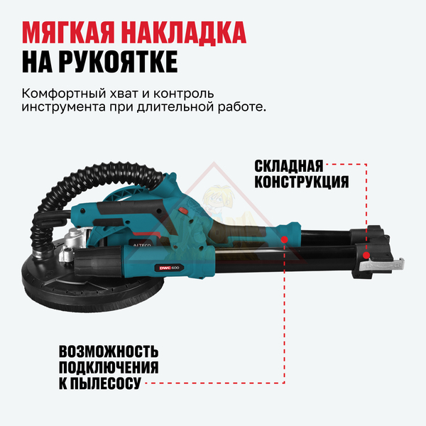 Шлифмашина для стен ALTECO DWC 600 35691 пригодится при внутренней отделке и ремонте помещений. Двигатель мощностью 600 Вт обладает высокой производительностью и позволяет легко справиться как со шлифованием стен, так и потолков.