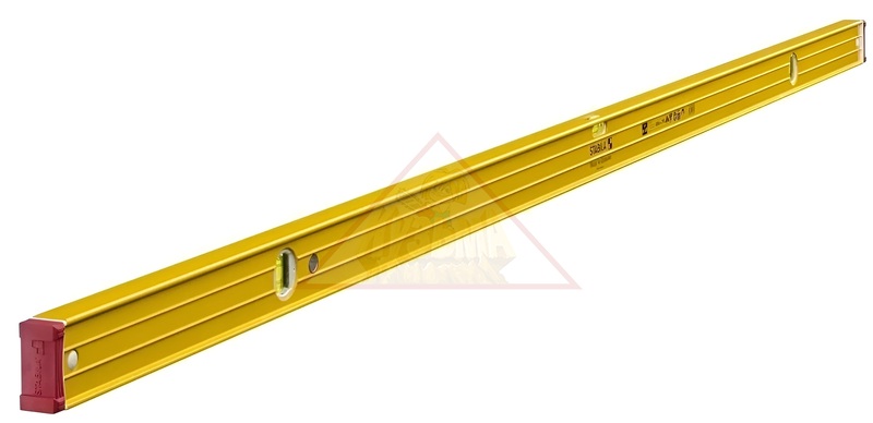 Ребристый прямоугольный профиль из легкого метала с фрезерованной измерительной поверхностью, 2 вертикальных и 1 горизонтальный уровень, 2 или 4 высокомощных магнитных системы в зависимости от длины.