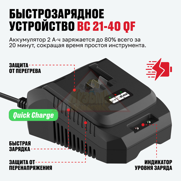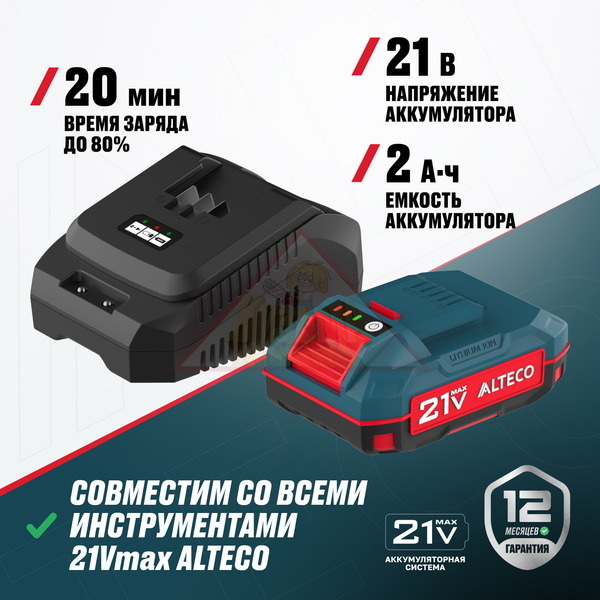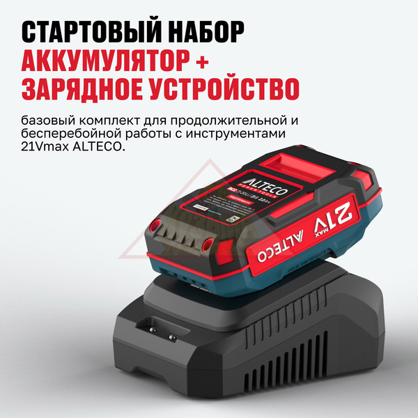 Стартовый набор ALTECO аккумулятор 1×21Vmax 2Ah и зарядное устройство (BCD 21-20 Li + BC 21-40 QF) — базовый комплект для продолжительной и бесперебойной работы с инструментами 21Vmax ALTECO. Аккумулятор оснащен защитой от полного разряда и перегрева, а также качественными высокопроизводительными литий-ионными ячейками, обеспечивающими долговечность и стабильную отдачу мощности. Зарядное устройство с током 4 А обеспечивает быструю подзарядку: до 80% емкости батареи 2 А·ч всего за 20 минут. Наличие индикатора позволяет легко контролировать уровень заряда.