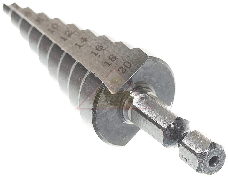 Сверло ступенчатое по металлу используется для сверления отверстий разных диаметров в материалах из стали, цветных металлов, листовой стали, нержавейки и пластика. Ступенчатым сверлом предусмотрено сверление отверстий диаметром от 4 до 20 мм. Шестигранный хвостовик предотвращает проскальзывание сверла в патроне и подходит практически ко всем типам дрелей, шуруповертов и быстросъемных адаптеров.